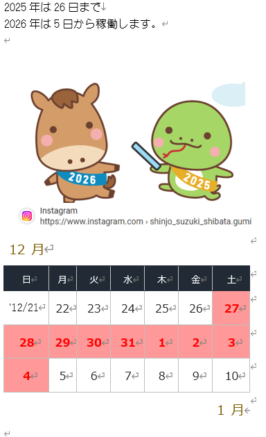 年末年始のお知らせ