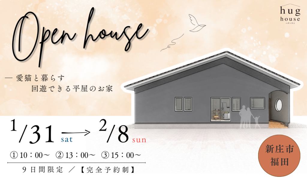 2026.01.30 お知らせ ブログ 完成見学会🏡開催します 新庄市福田地内にて、お客様邸完成見学会を開催します🍀 買い物帰りの帰宅動線やプライベート空間と分けた間取りとなっております。 お施主様ご希望のプランに暮らしやすさをプラスしました。 見学のご予約は下記リンクよりお願いします😌 愛猫と暮らす回遊できる平屋のお家 PREV BACK