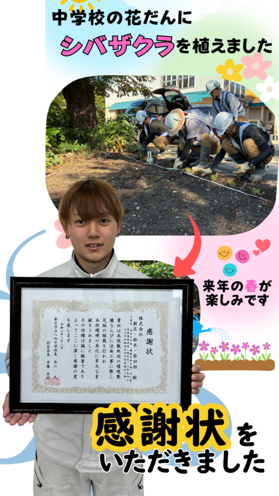 2026.03.05 お知らせ 感謝状をいただきました! 新田川現場の地域貢献として行った、『中学校の校庭に芝桜植栽』について感謝状をいただきました!八向中最後の年を彩ることができました。 PREV BACK