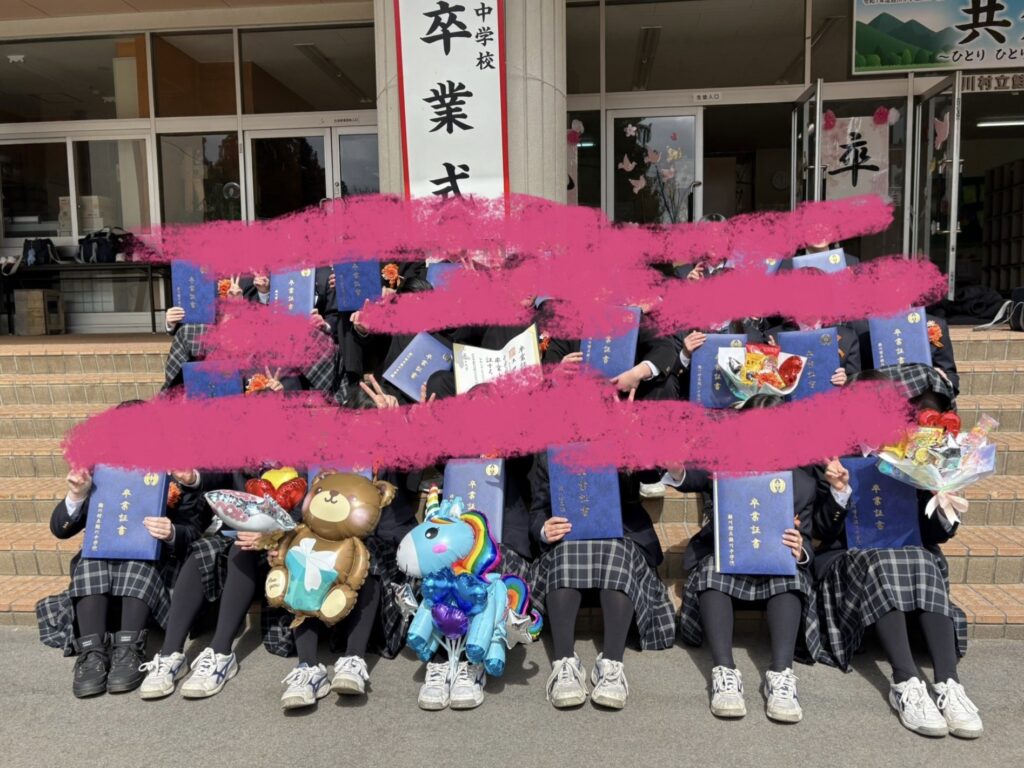 2026.03.19 ブログ 卒業しました🌸 最近は晴れの日が続いてウキウキしますね☀ 春の匂い感じるようになった今日この頃、旅立ちの季節となりました。 先週、娘が無事に中学校を卒業いたしました。 義務教育の9年間が終わり、ひとまずほっとしてるところです。 楽しかったこと辛かったこと、激しく喜怒哀楽を表現してきた9年間、 関わった方に感謝の気持ちでいっぱいです。 4月からは高校生🍀 大人の階段は早いですね~ まだまだ元気いっぱいがんばろう! 卒業おめでとう! 写真、10人ぐらい写ってなくて残念🤧 PREV BACK